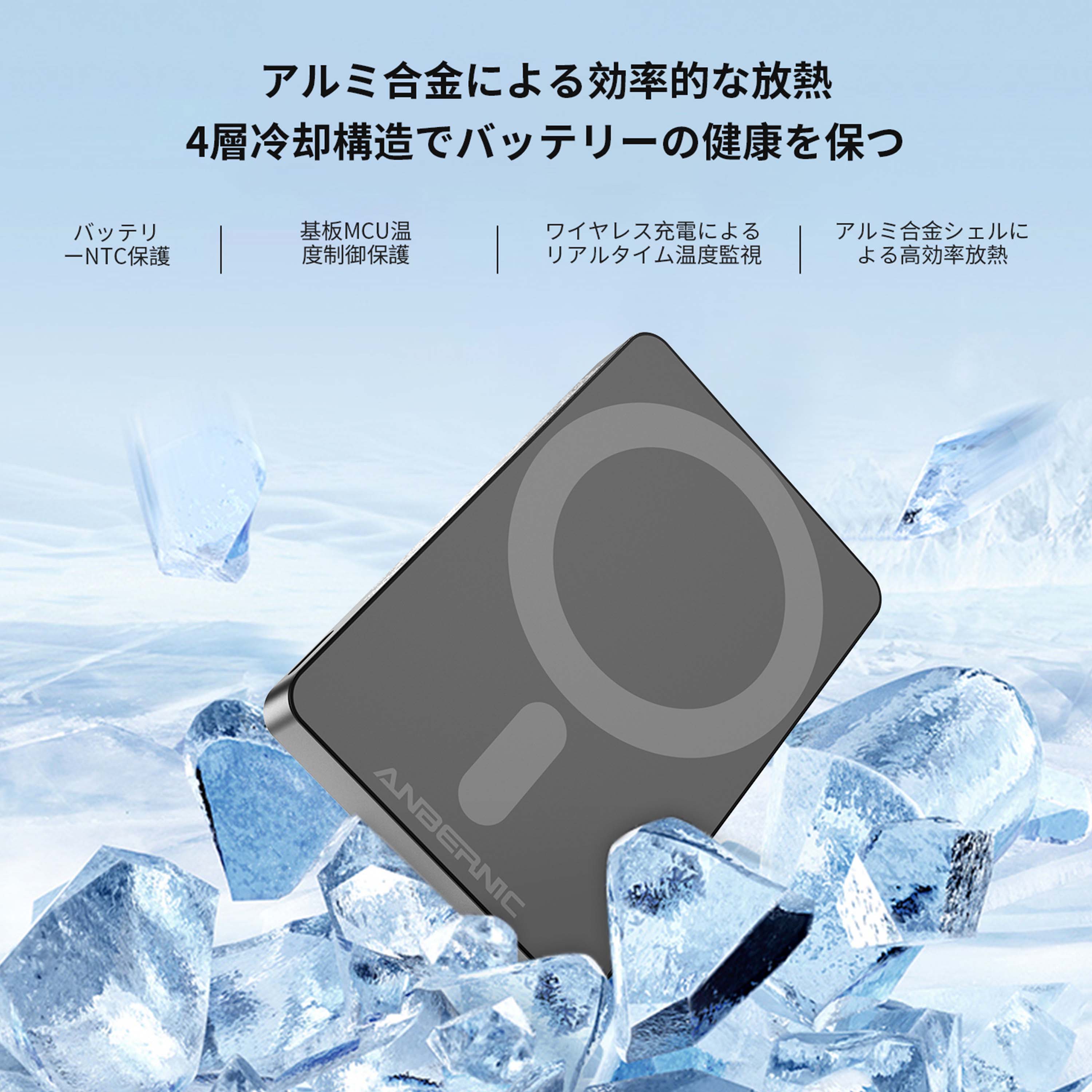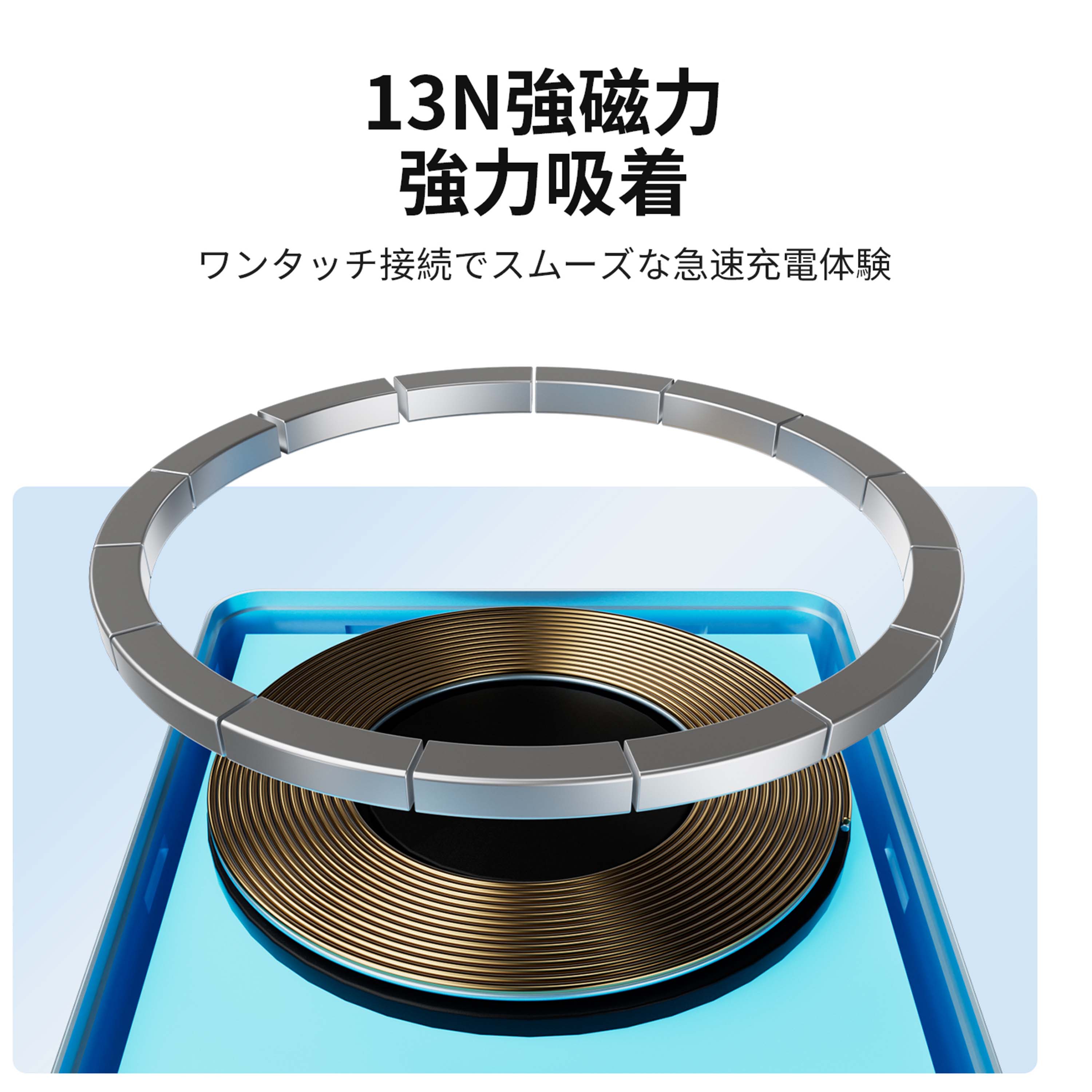 | 他の機能 | スタンド設計による瞬時充電対応。iPhoneおよびAndroidのワイヤレス充電対応機器に対応。強力な磁力吸着を備え、ワイヤレス充電と有線充電の同時2台充電が可能。過熱防止の安全保護機能付き |