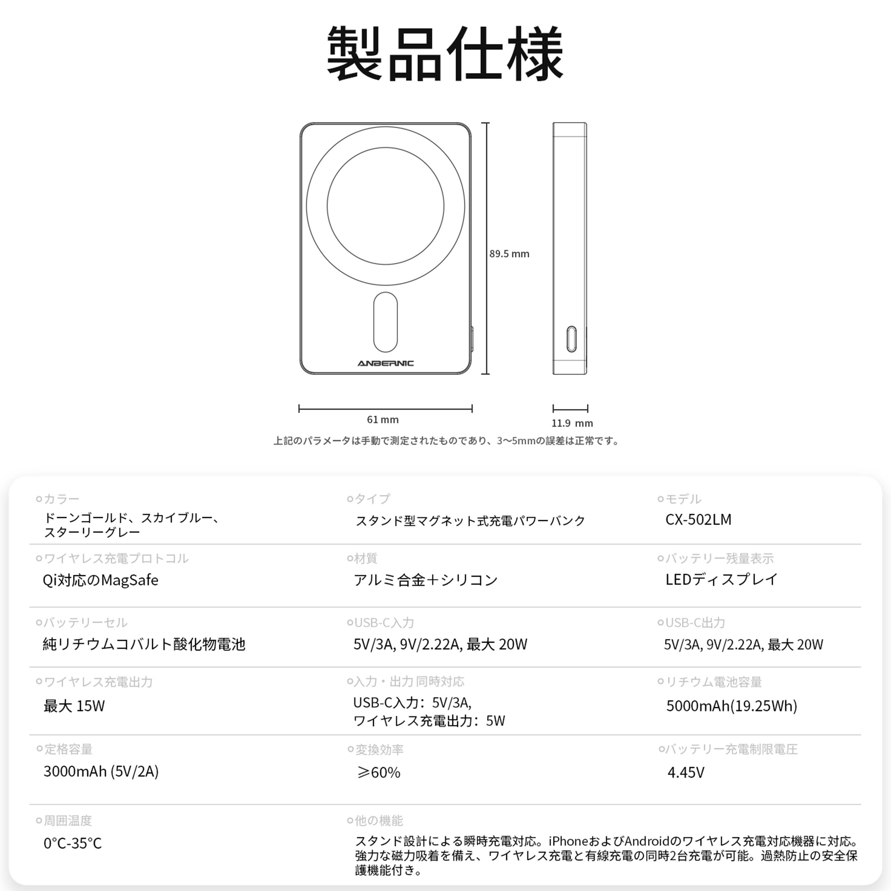 | 入力・出力 同時対応 | USB-C入力:5V/3A、ワイヤレス充電出力:5W |