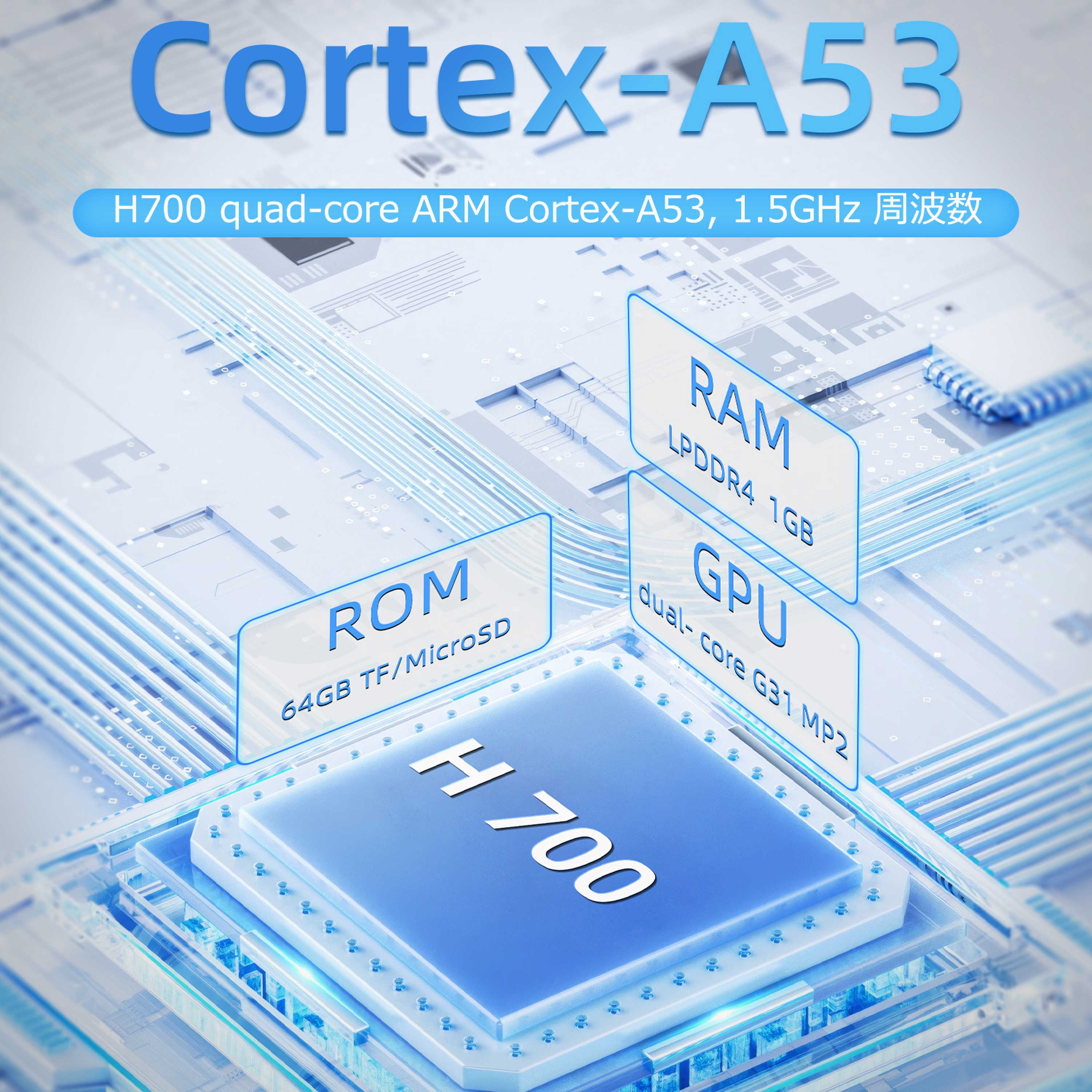 | CPU | H700 quad-core ARM Cortex-A53、1.5GHzの周波数 |