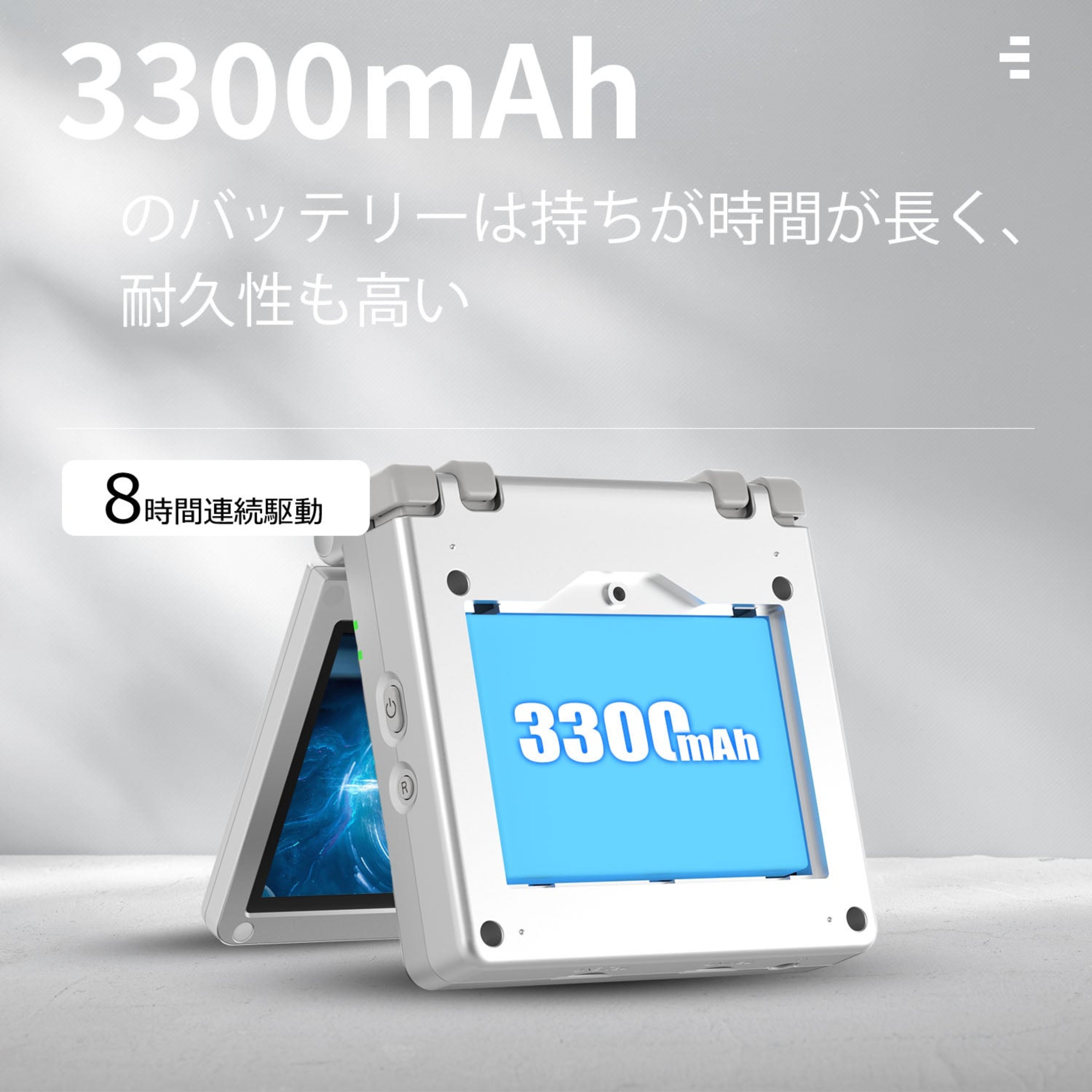 | バッテリー | リチウムバッテリー3300mAh、役8時間の稼働が可能 |