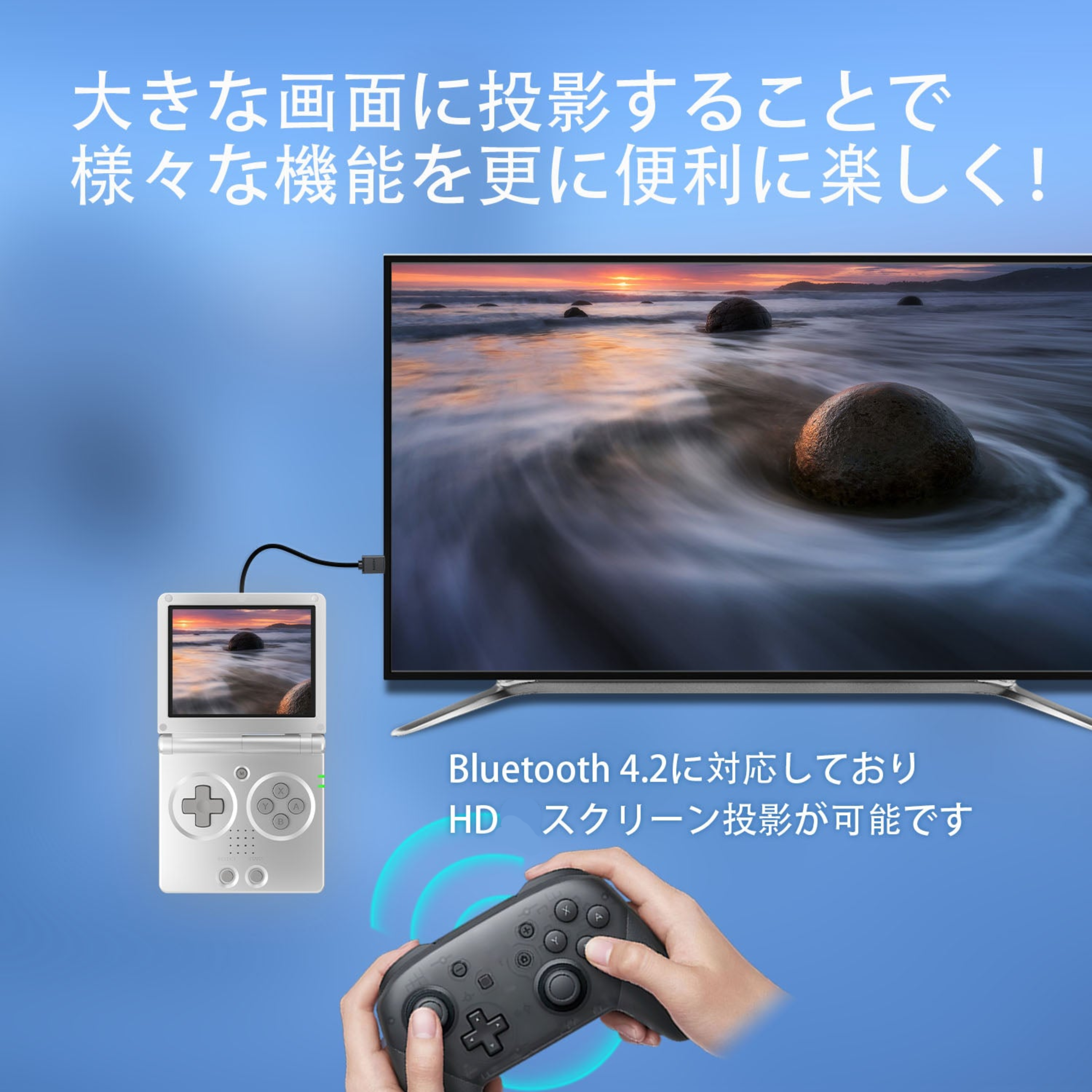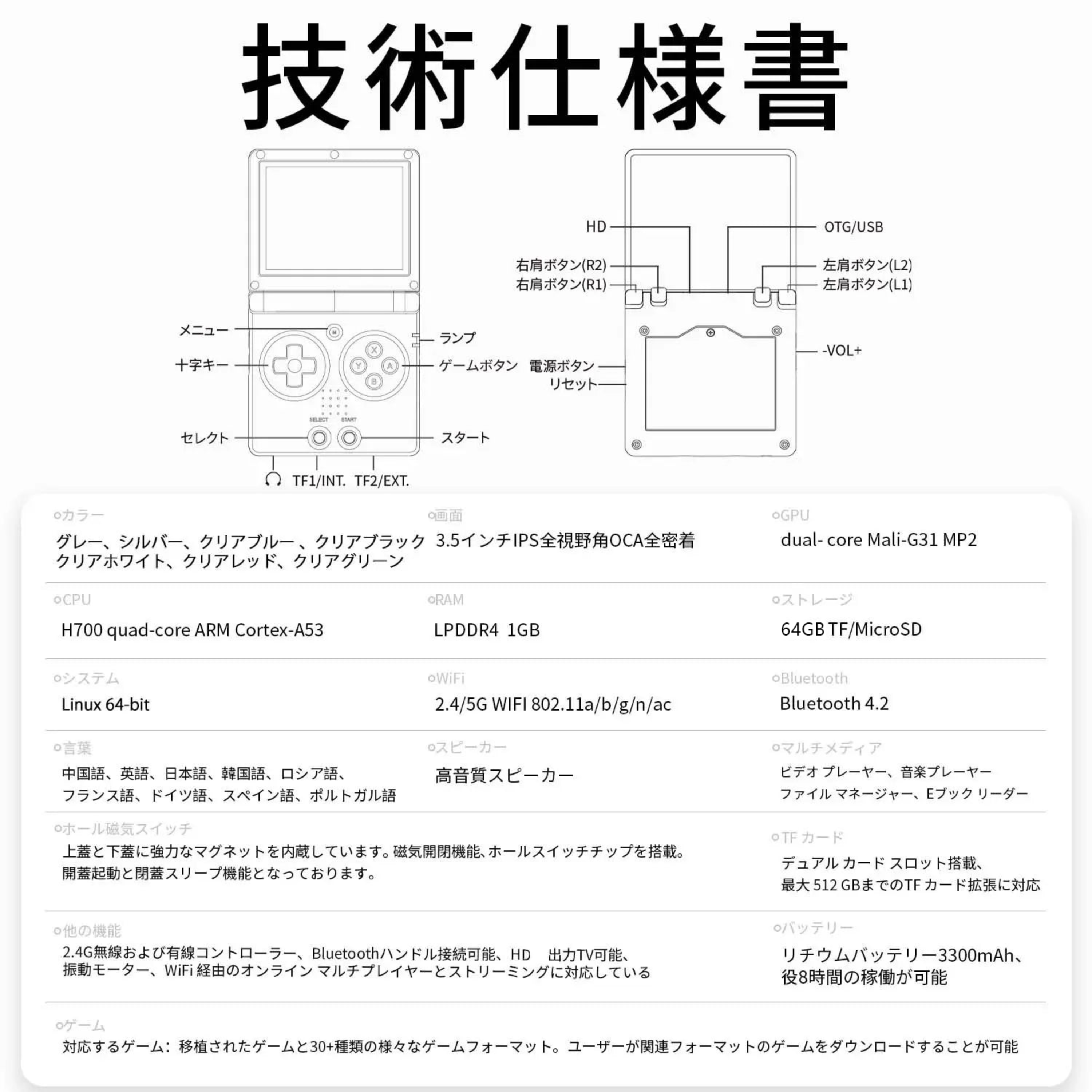 | 他の機能 | 2.4G無線および有線コントローラー、Bluetoothハンドル接続可能、HD出力TV可能、振動モーター、WiFi 経由のオンライン マルチプレイヤーとストリーミングに対応している |
