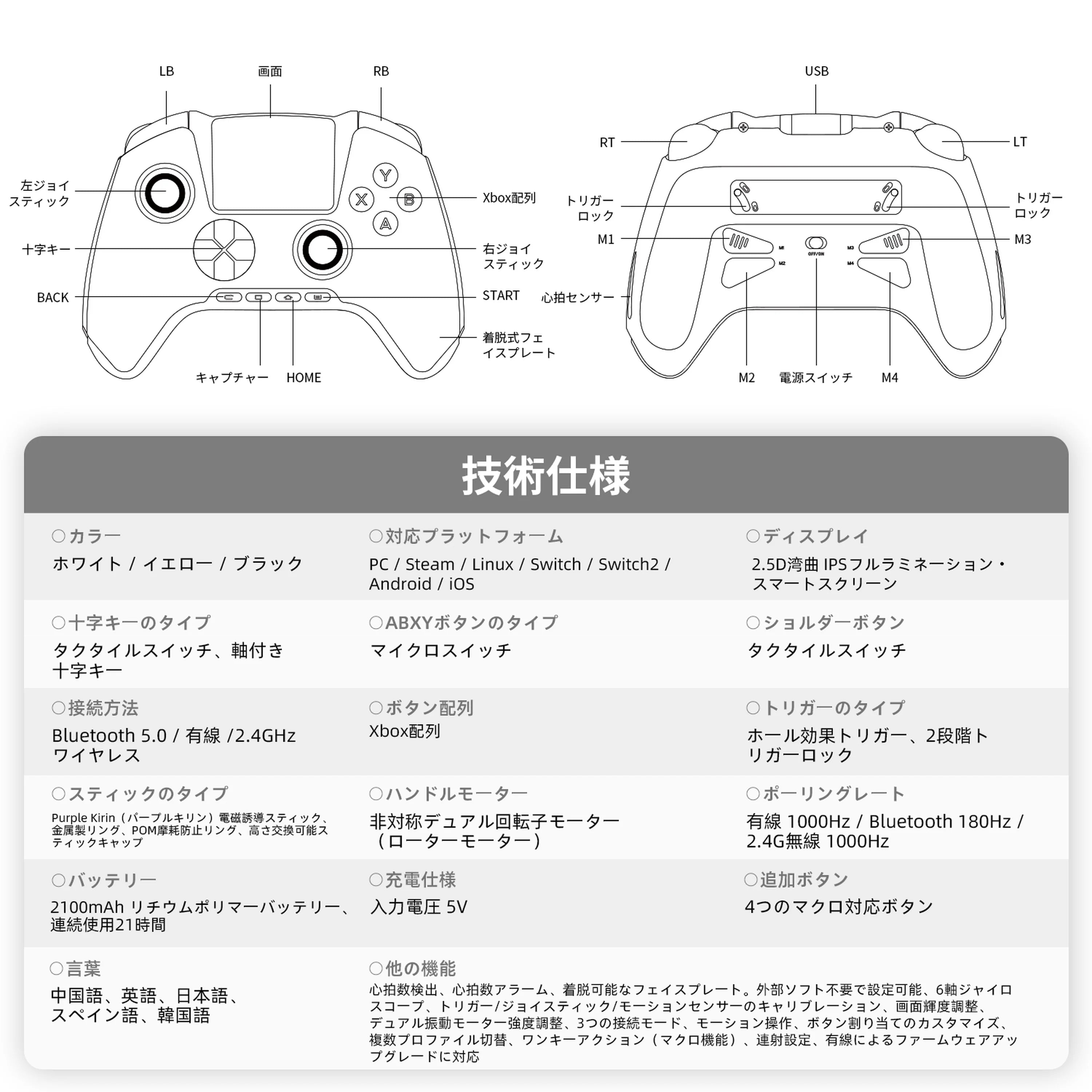 | その他の機能 | 心拍数検出、心拍数アラーム、着脱可能なフェイスプレート。外部ソフト不要で設定可能、6軸ジャイロスコープ、キャリブレーション機能、画面輝度調整、振動強度調整、プロファイル切替、マクロ機能、連射設定など。 |
