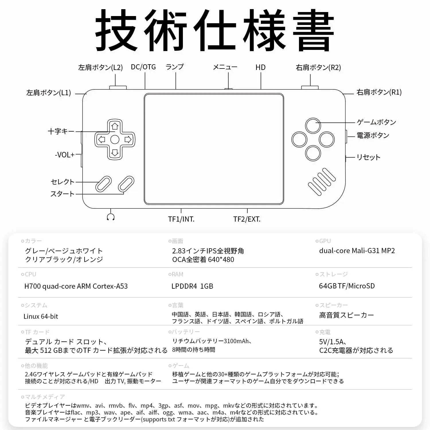 | 他の機能 | 2.4Gワイヤレス ゲームパッドと有線ゲームパッド接続可能/HD出力TV、振動モーター |