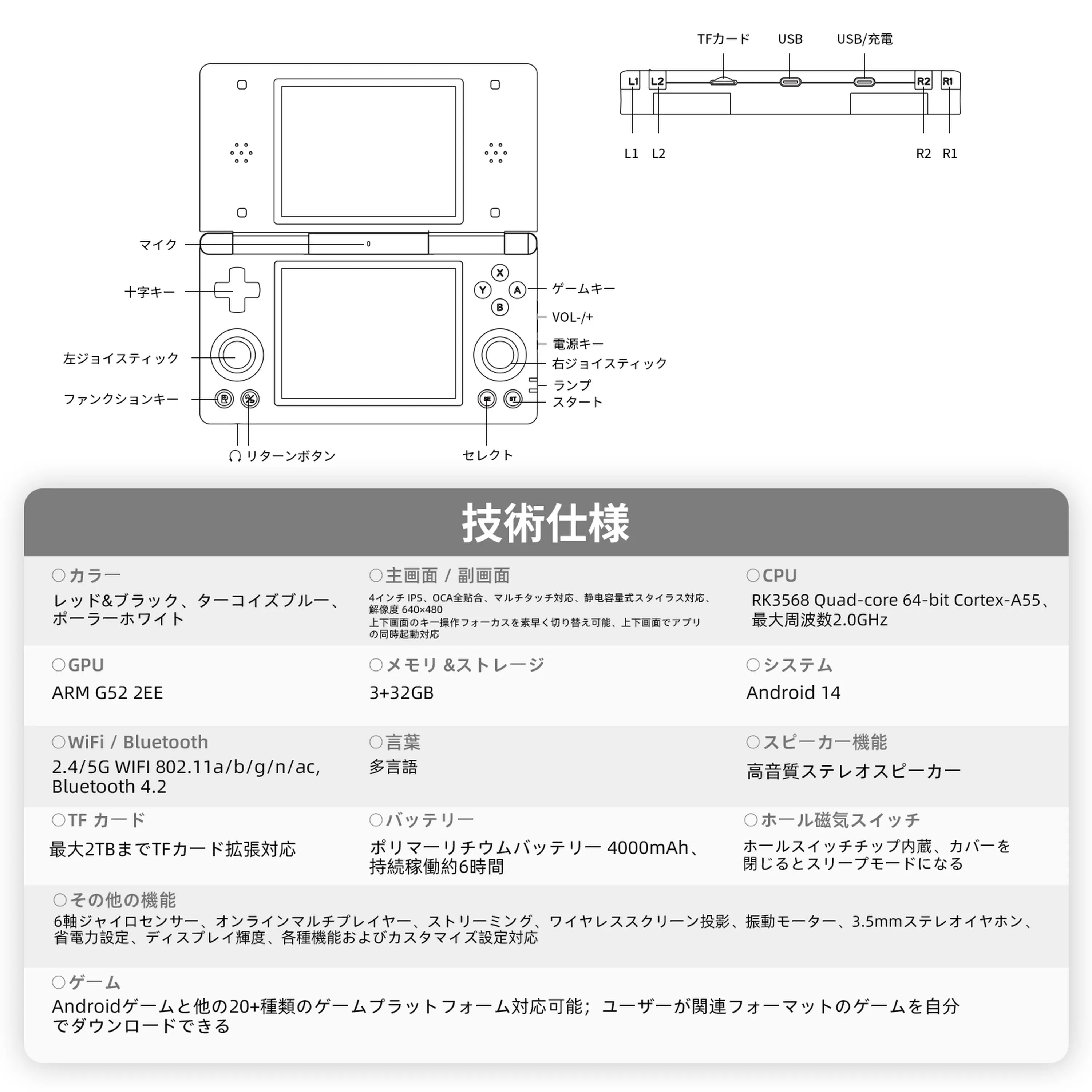 | その他の機能 | 6軸ジャイロセンサー、オンラインマルチプレイヤー、ストリーミング、ワイヤレススクリーン投影、振動モーター、3.5mmステレオイヤホン、省電力設定、ディスプレイ輝度、各種機能およびカスタマイズ設定対応 |
